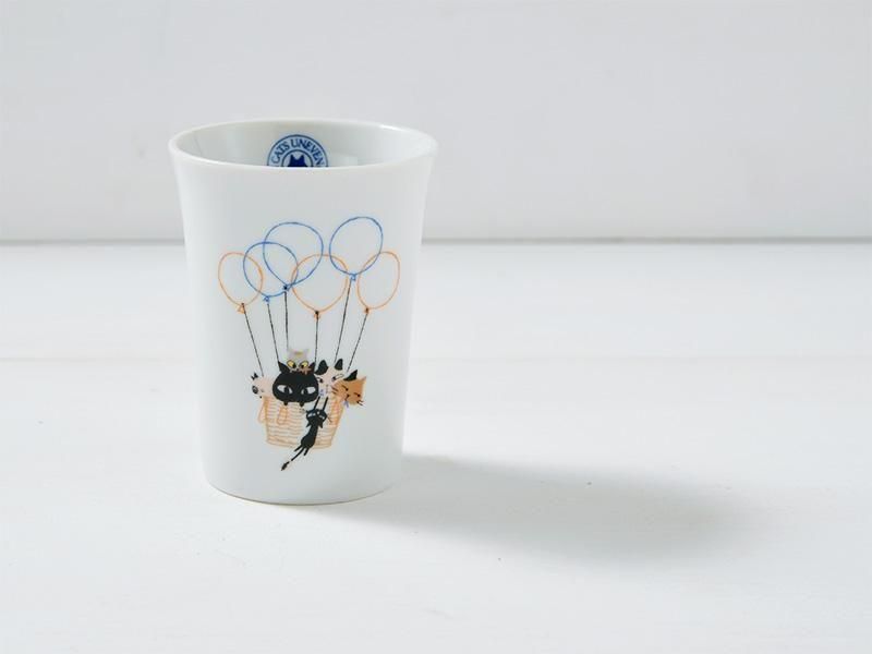 A. 雑貨デザイナーシンジカトウデザインによる、不揃いな猫たちが気球や風船を持って空を旅する様子が描かれています。