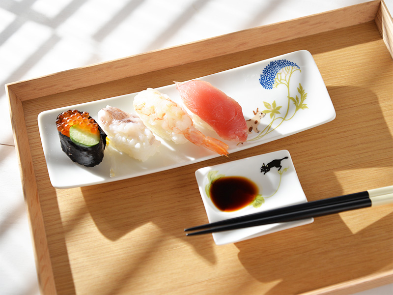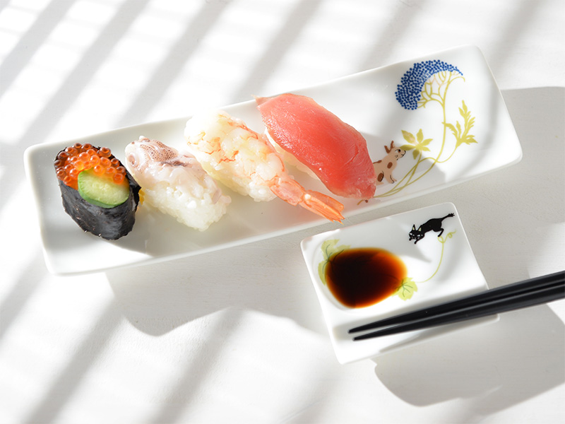 お寿司が映えるシックな猫のイラストが特徴のプレート。