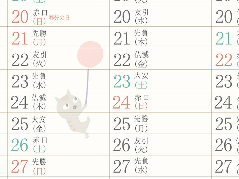 - 重要な日付(吉日や凶日)を見逃してしまう: 六曜表示が含まれているため、吉日や凶日を簡単に確認できます。
