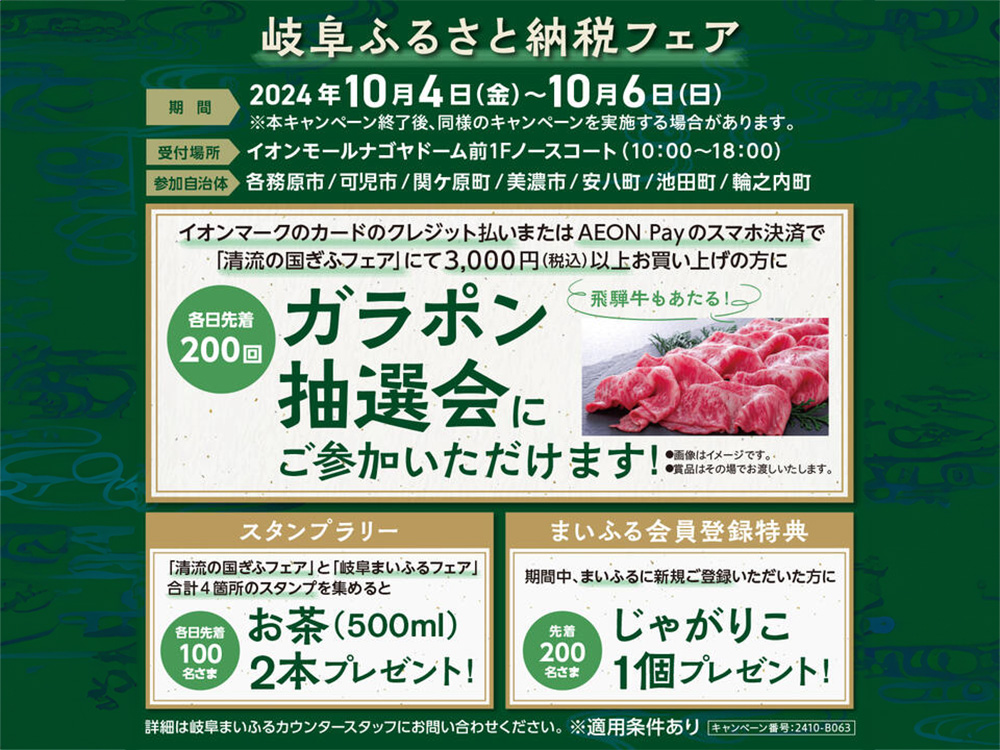 そして、さらに楽しいお知らせです!イオンマークのカードのクレジット払いまたはAEON Payのスマホ決済で「清流の国ぎふフェア」にて3,000円(税込)以上お買い上げの方には、ガラポン抽選会にご参加いただけます🎁。素敵な景品が当たるチャンスをお見逃しなく!