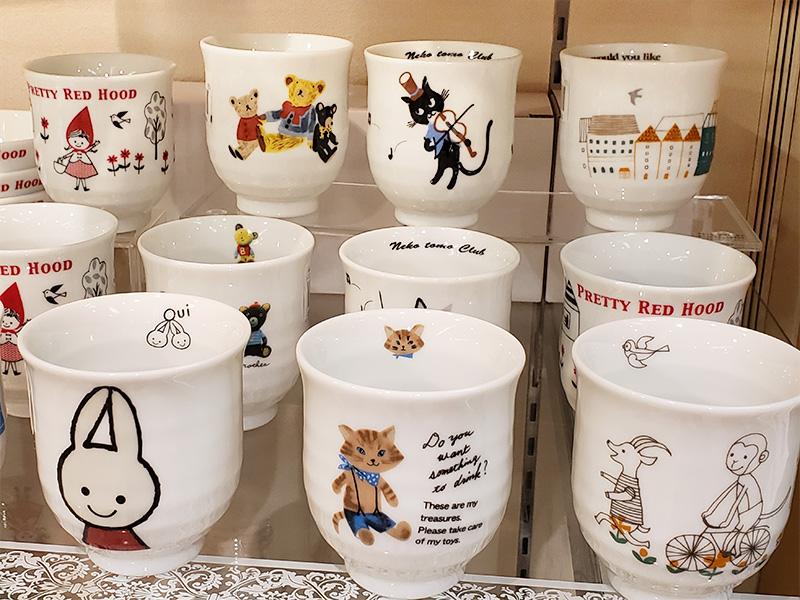 ほら見てください!愛らしい動物さんや物語のキャラクターが描かれた湯呑みや小皿は、手に取るたびにほっこりしちゃいますよね。旅の思い出やお土産にもぴったりですよ!🎁