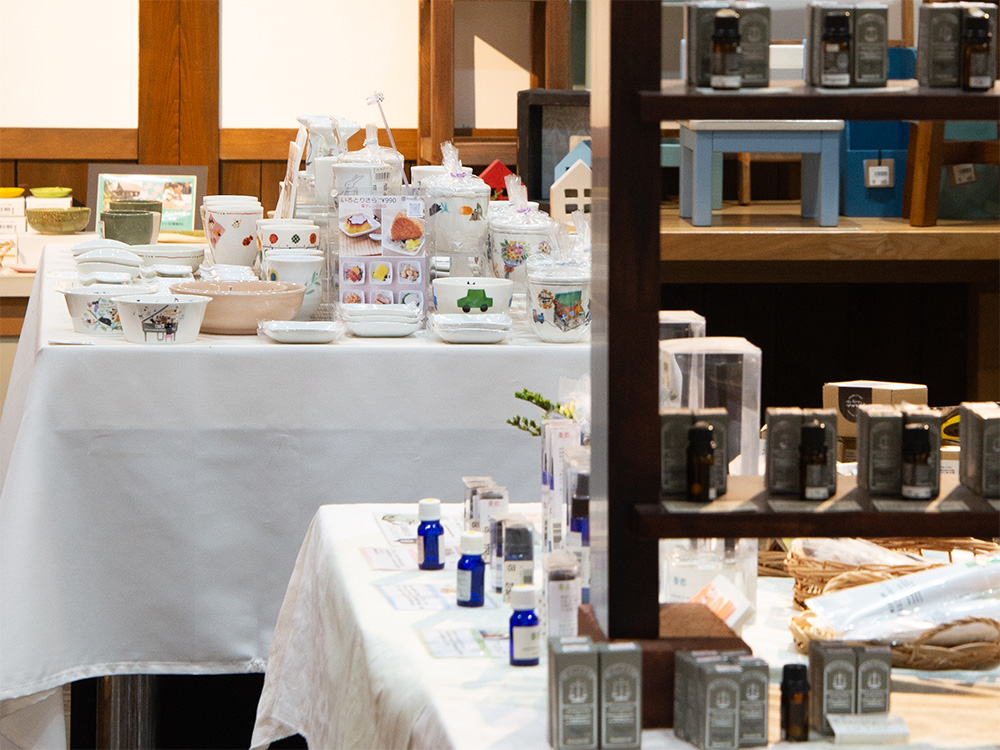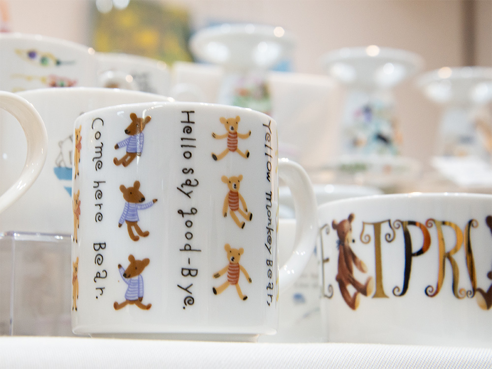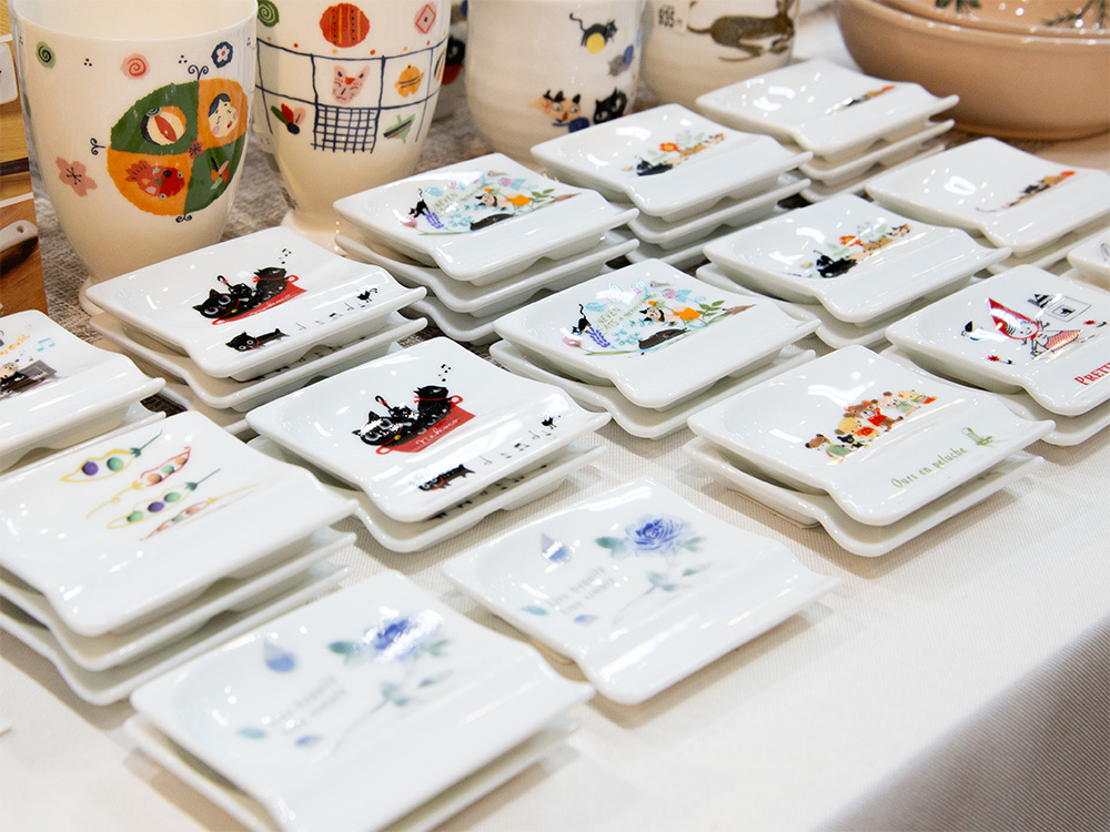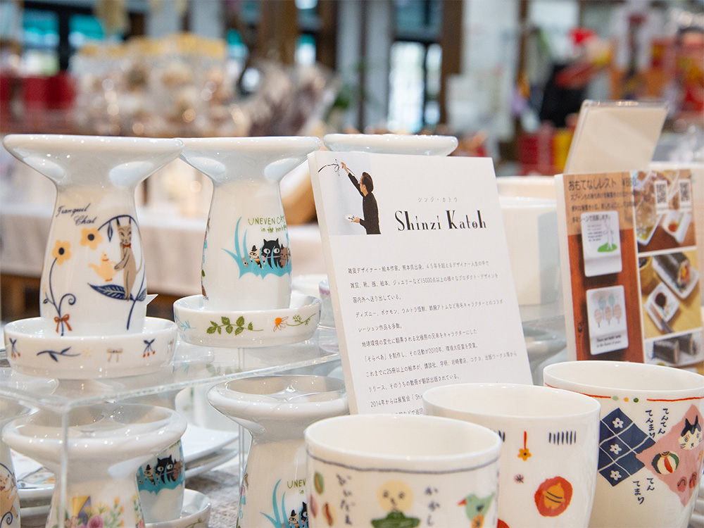 また、店内にはシンジカトウさんの心温まるイラストが描かれた食器がたくさん展示されています。美しいイラストとともに並ぶ色とりどりの食器は、お土産としても喜ばれること間違いなしです。
