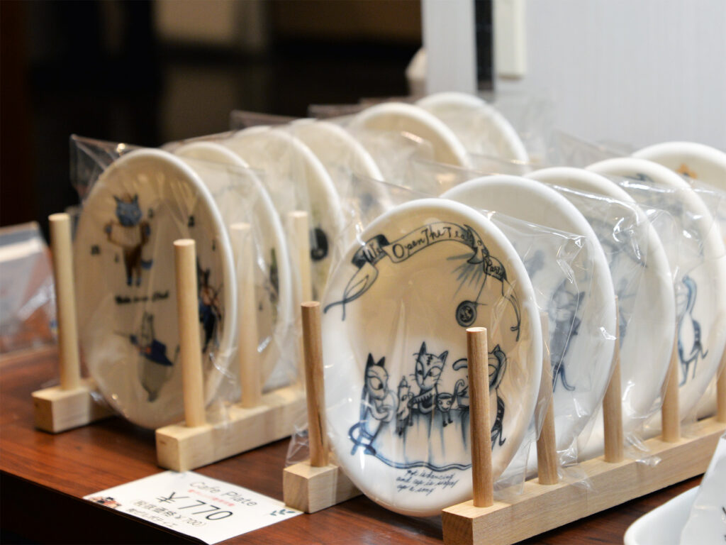 シンジカトウさんデザインの猫のイラストが陶器のお皿に描かれたゼルポティエオリジナル商品の画像です。