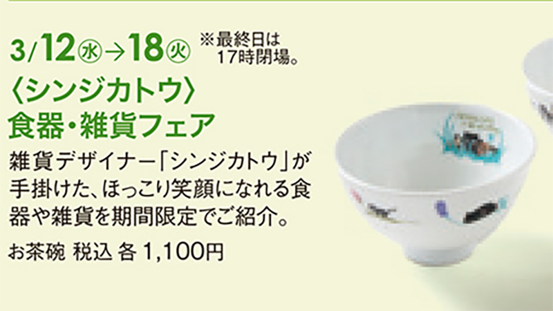 どんなイベント? 期間限定のこのイベントでは、シンジカトウさんのアイテムを幅広くラインナップしています。 日常使いの食器や帆布バッグ、キッチン雑貨など、見ているだけで気分が上がるデザインばかり!猫や花柄など細部にまでこだわった作品が盛りだくさんです。