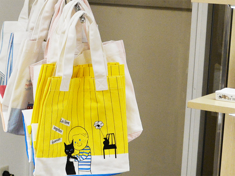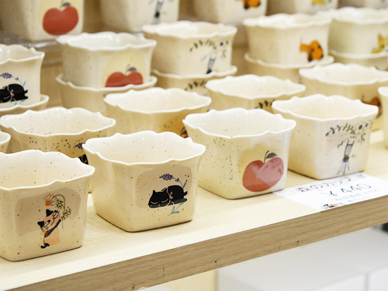 フェア会場では、シンジカトウらしいキュートなデザインがいっぱい!温かみのある手作り感があふれるディスプレイに、つい目を奪われてしまいます。今回は特に、新商品の「赤ずきんちゃんシリーズ」の食器や、大人気の猫イラスト入りお弁当箱に注目しました。