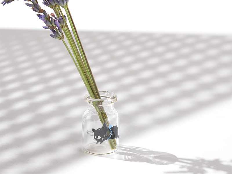 「アニーブンキャッツ シリーズ プチコルクビン」は、直径2.3cm、高さ3.5cmのコンパクトサイズ。ガラス製の小瓶にラベンダーを生けることで、お部屋に爽やかな香りと癒しの空間を作り出します。