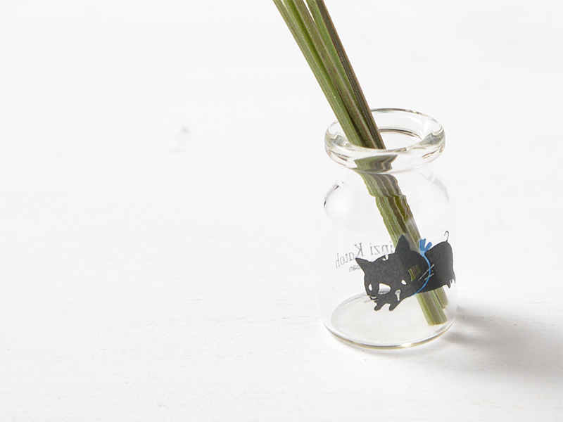 瓶の表面には、雑貨デザイナーシンジカトウさんが描いた黒猫のイラストが施されています。シンプルでありながらも愛らしいデザインが特徴で、黒猫は幸運のシンボルとしても知られています。どんなインテリアにも自然に溶け込むデザインです。